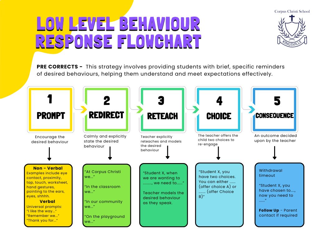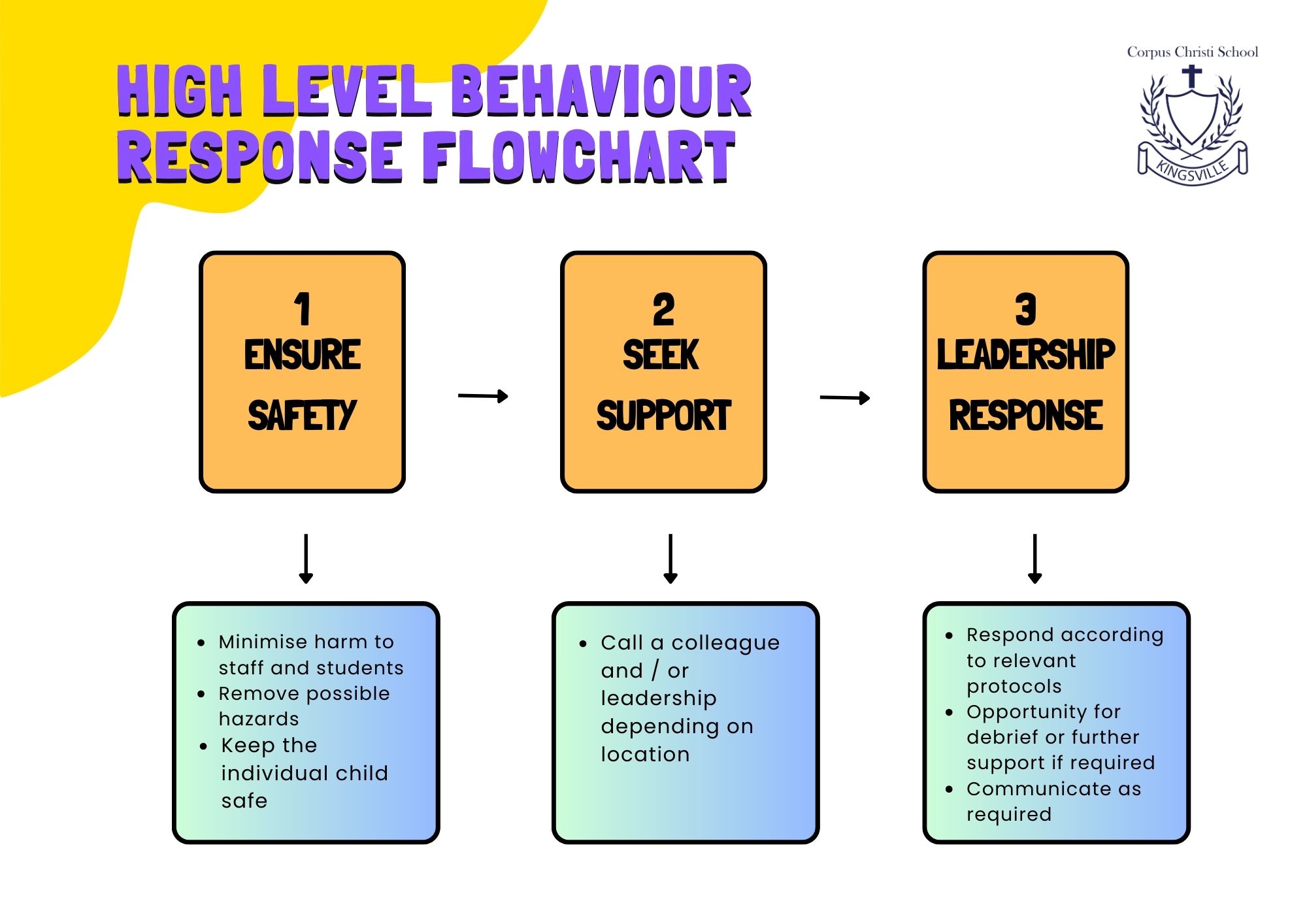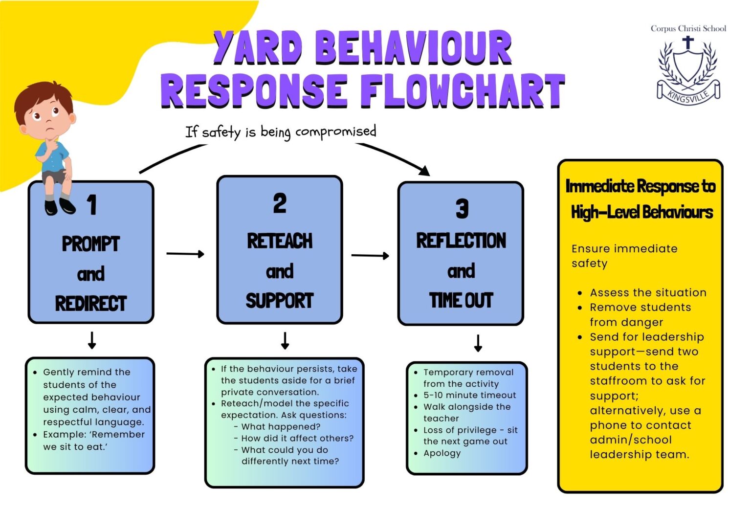 At Corpus Christi, we use clear and consistent processes to guide how we respond to student behaviour. Our behaviour response flowcharts show the steps teachers and staff take to support students in making positive choices while keeping our school safe and respectful. This approach helps ensure that all students are treated fairly and given the chance to learn, reflect, and grow from their experiences.